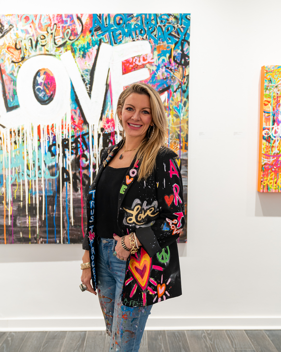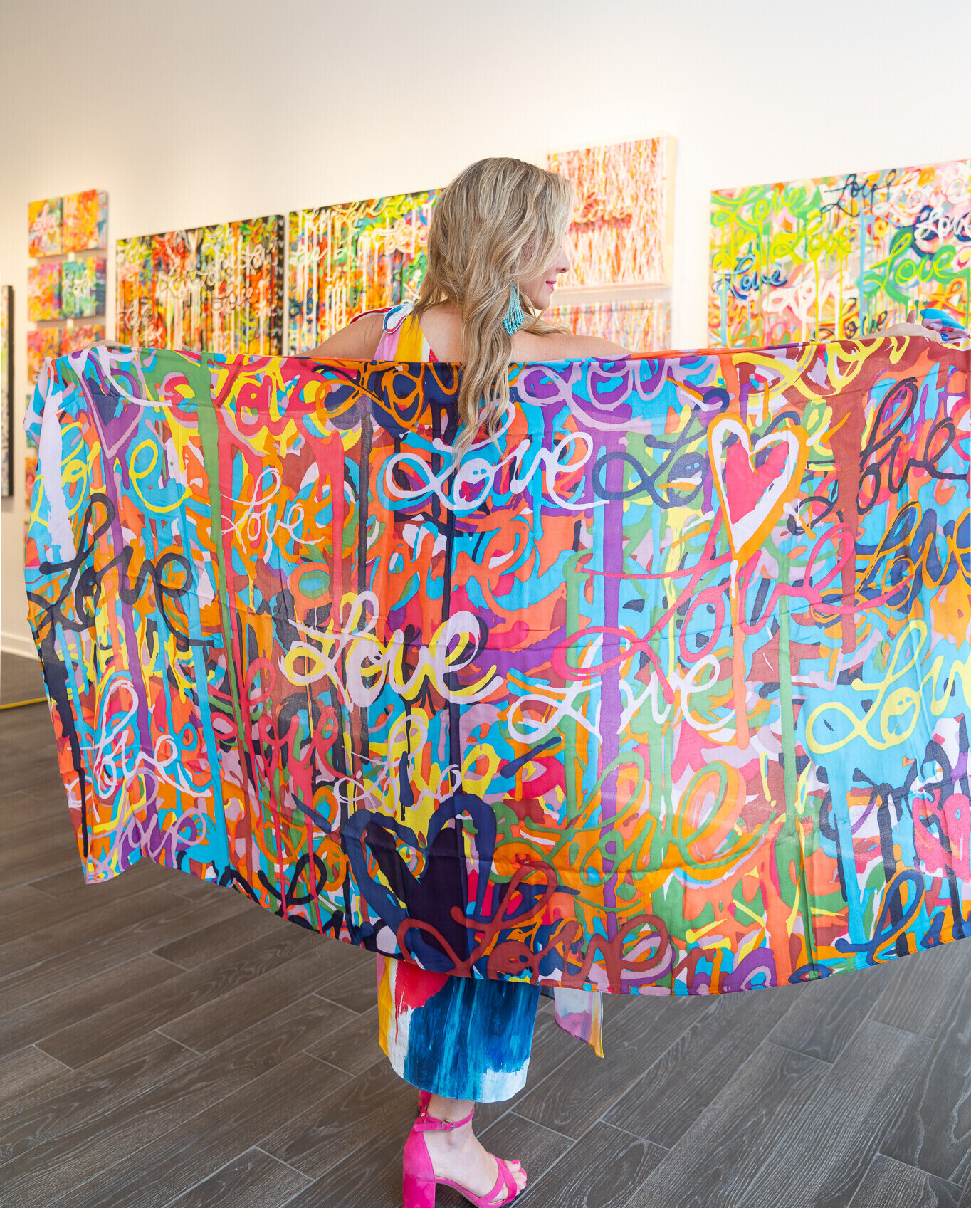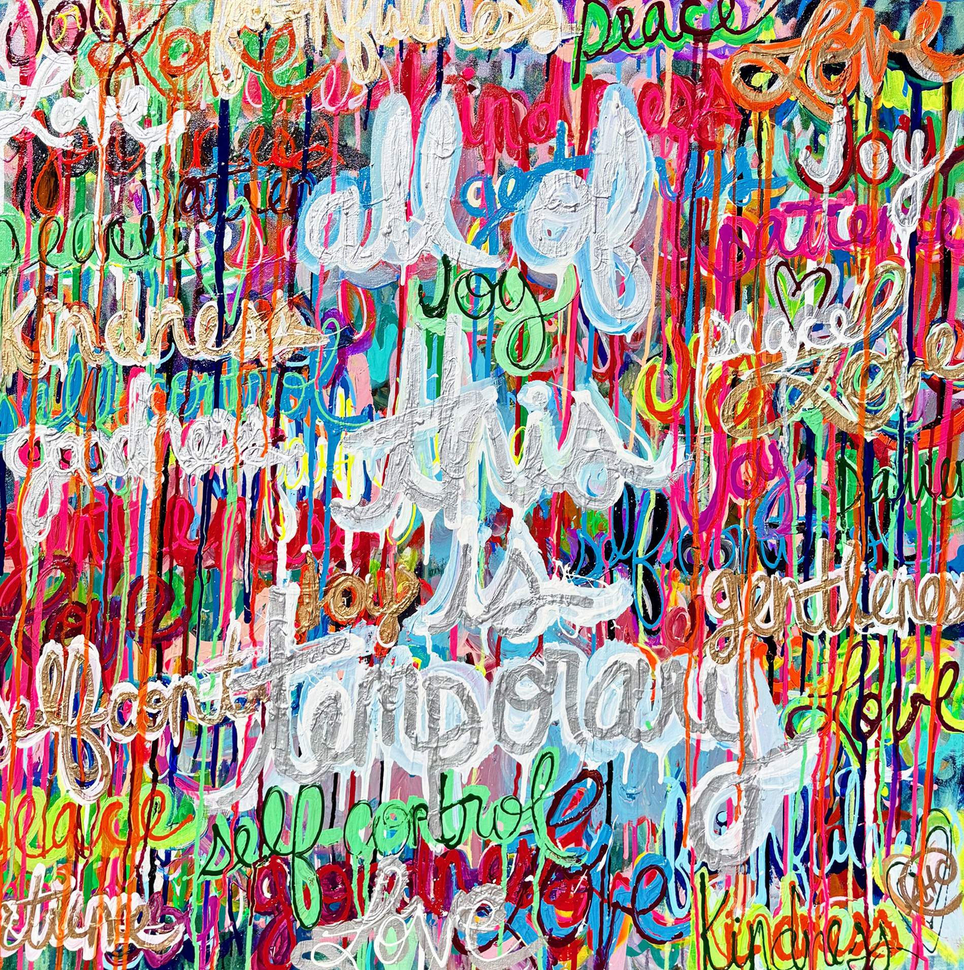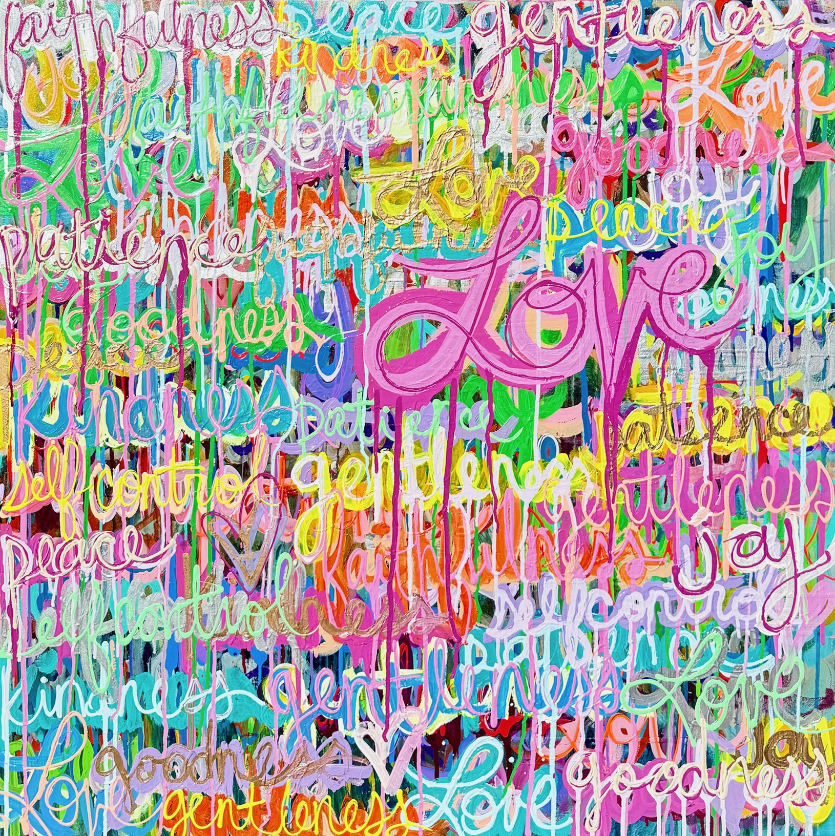 Castillo finds inspiration in motivational podcasts, uplifting music, and everyday life as a mother of three children. Her favorite mantra “All of this is temporary’’ personifies her creative process and can be found woven into her work. Other unique words and phrases appear in this latest Love series making each piece feel like its own experience.