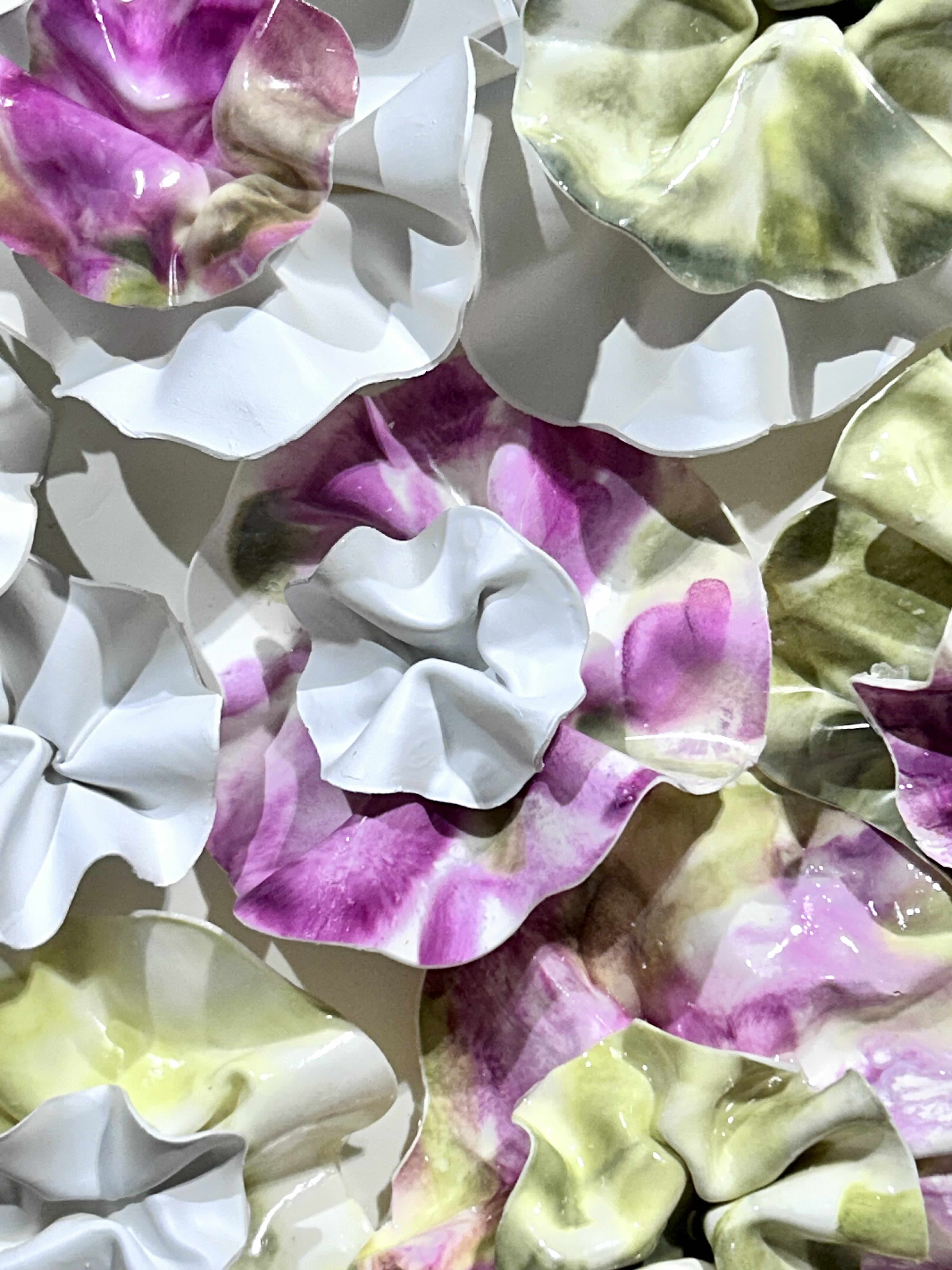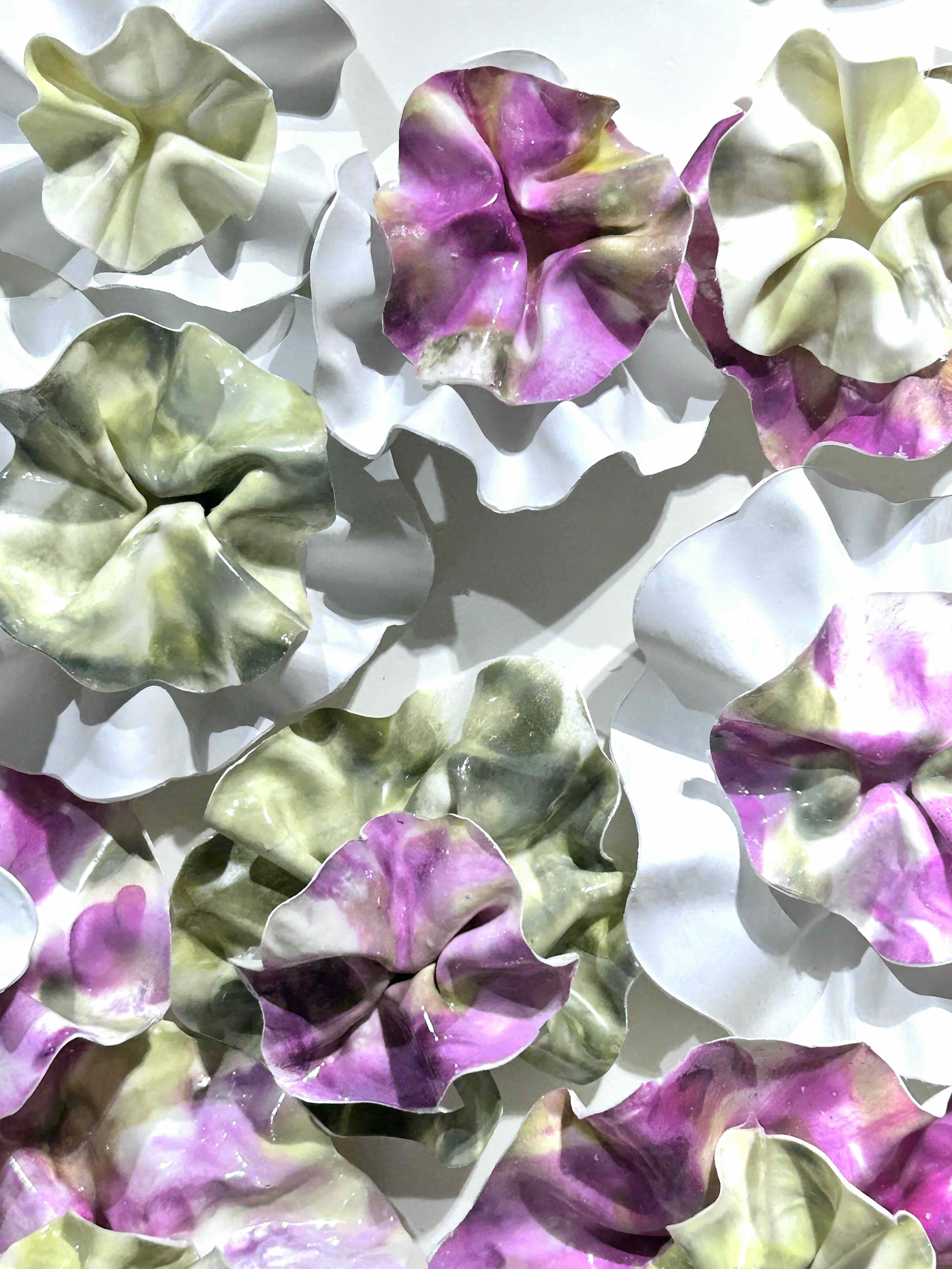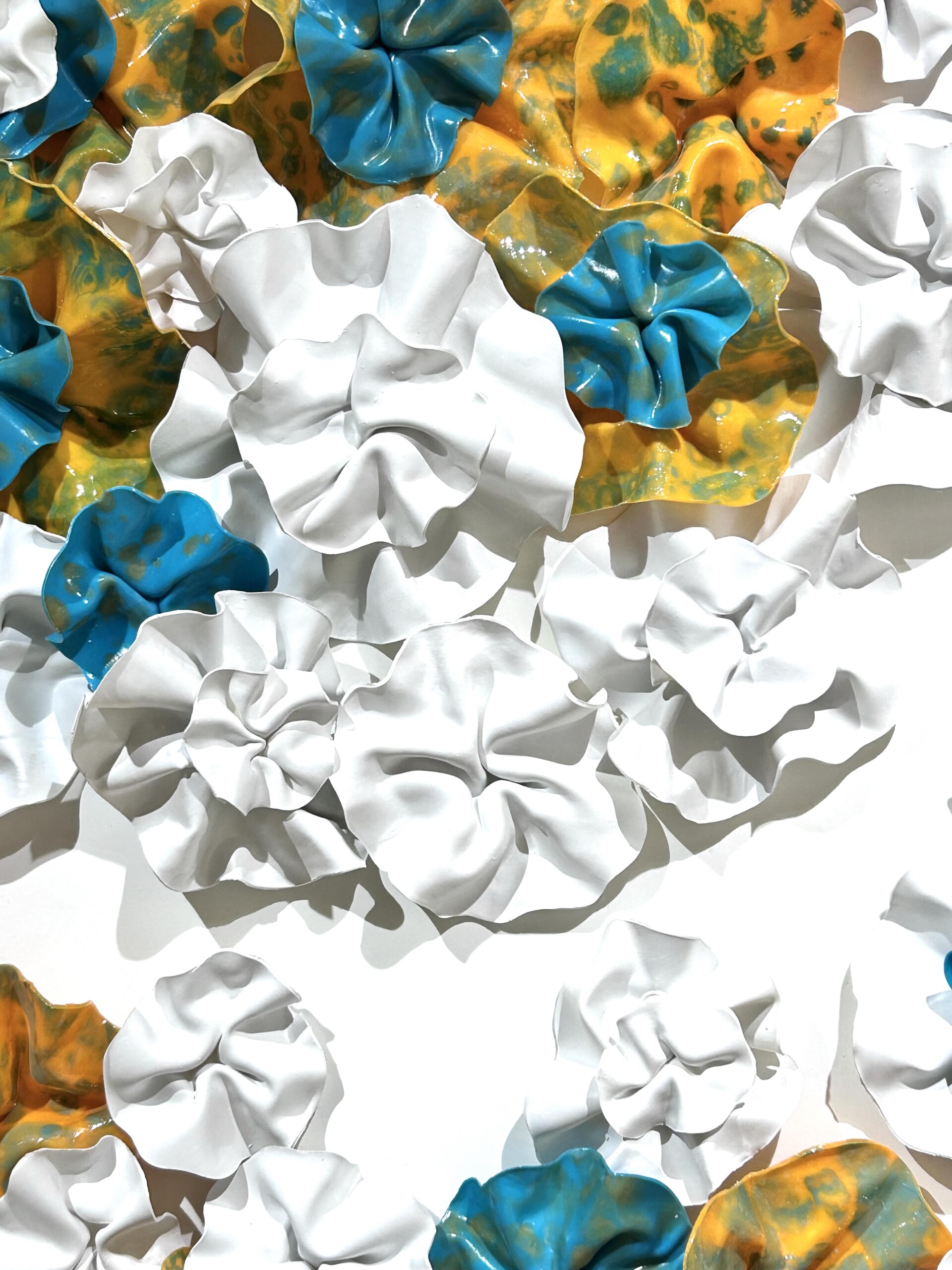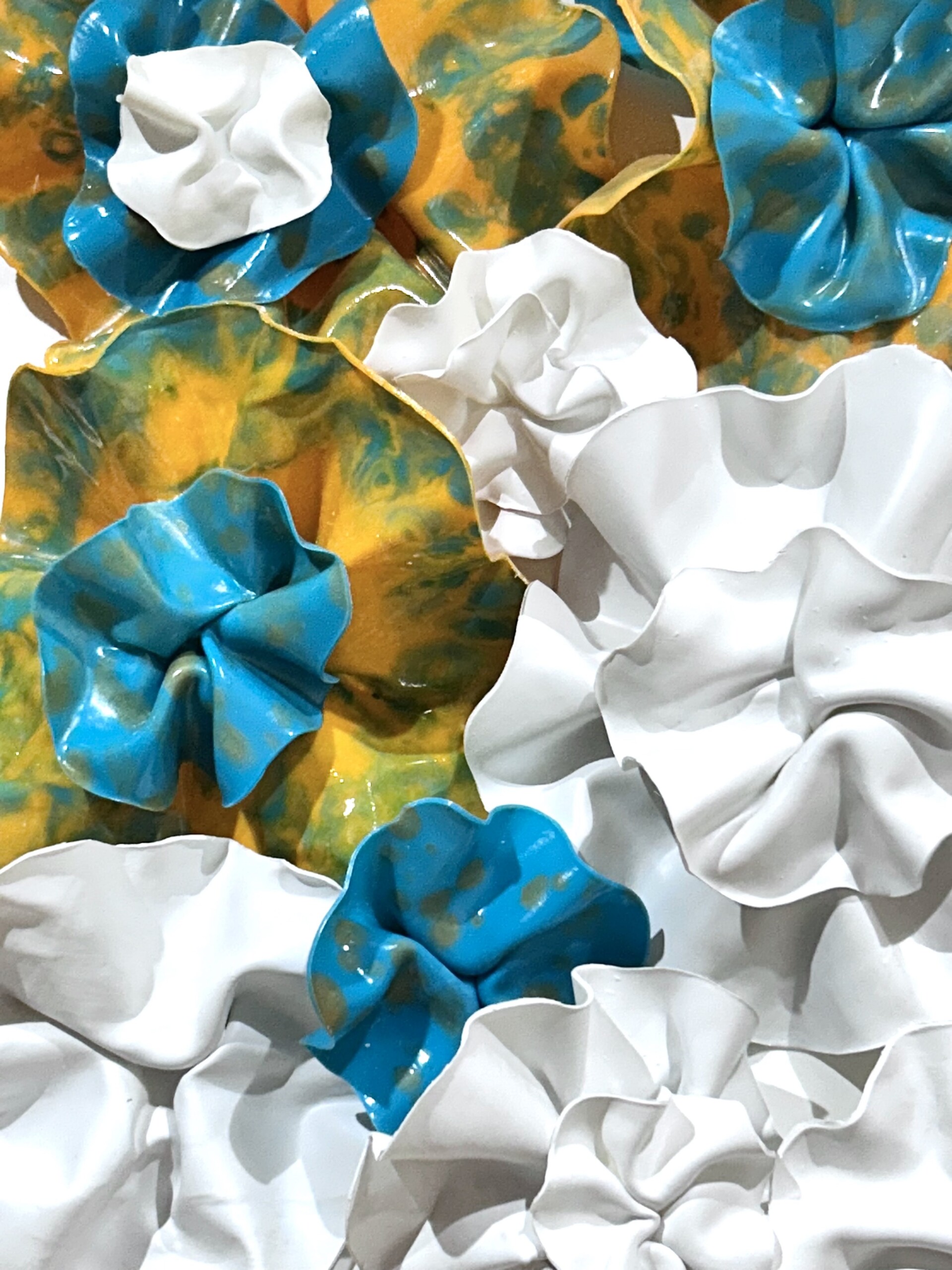 The fluidity and versatility inherent in encaustic painting enable me to delve into the complexities of organic forms, crafting textured surfaces and luminous depths that mirror the beauty and transience of the natural world. My work is characterized by meticulously hand-sculpted 3D forms that burst with vibrant colors, layered intricately throughout each composition.