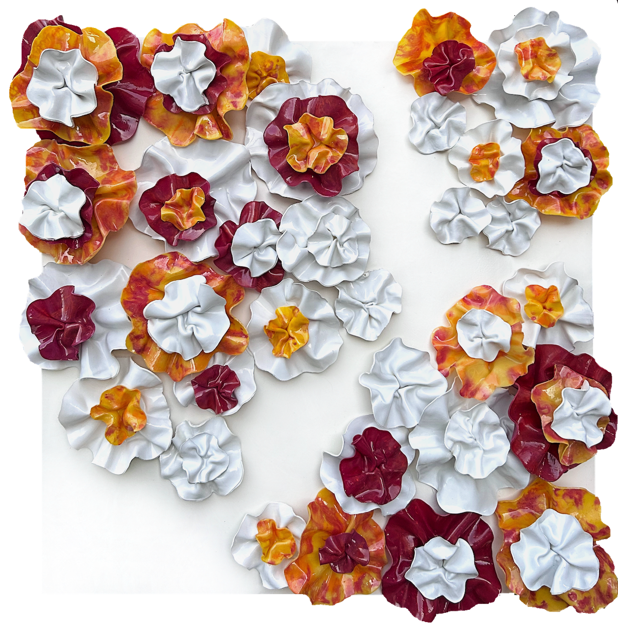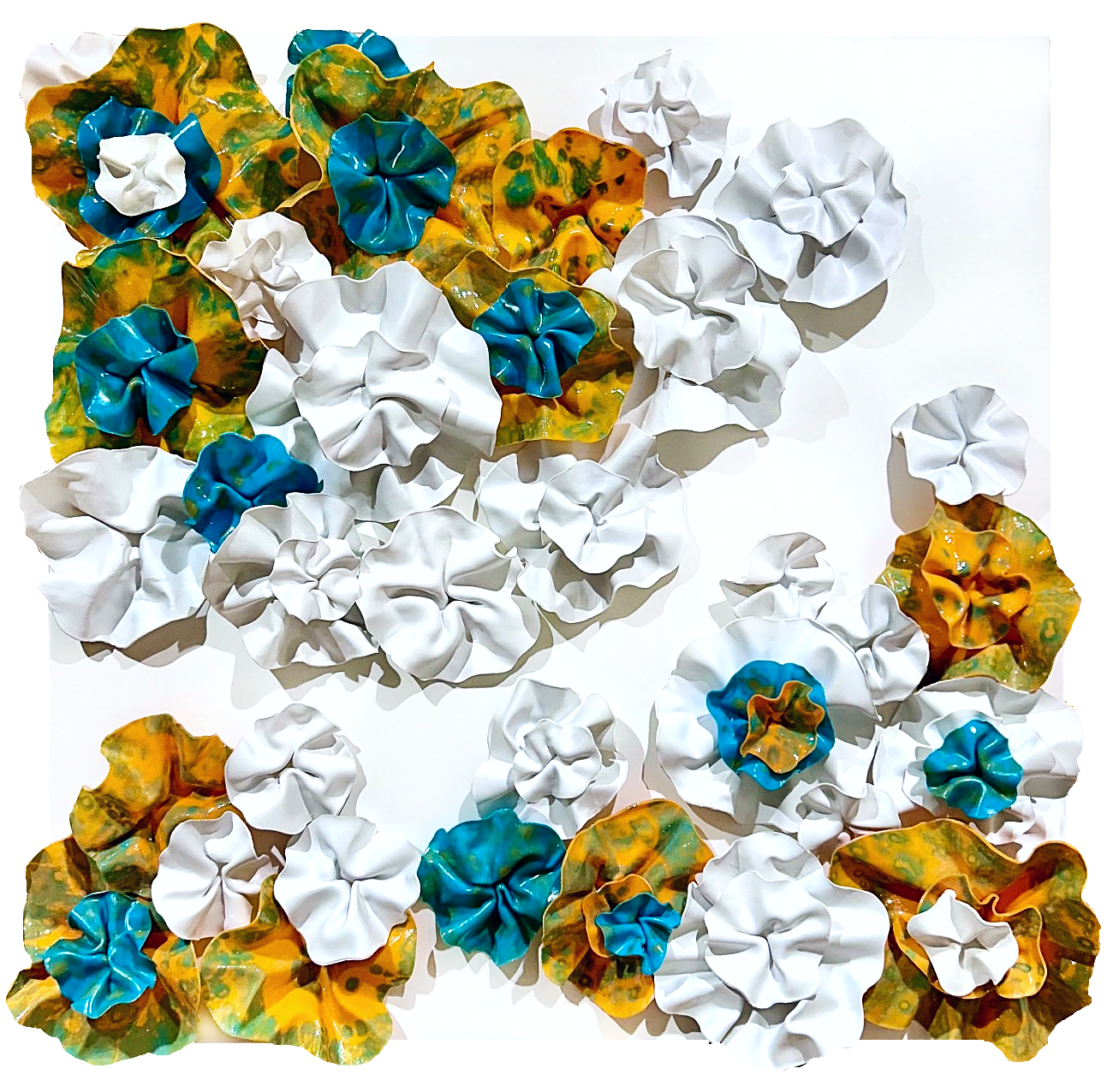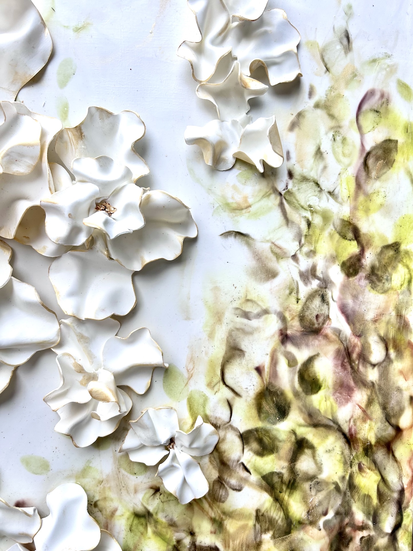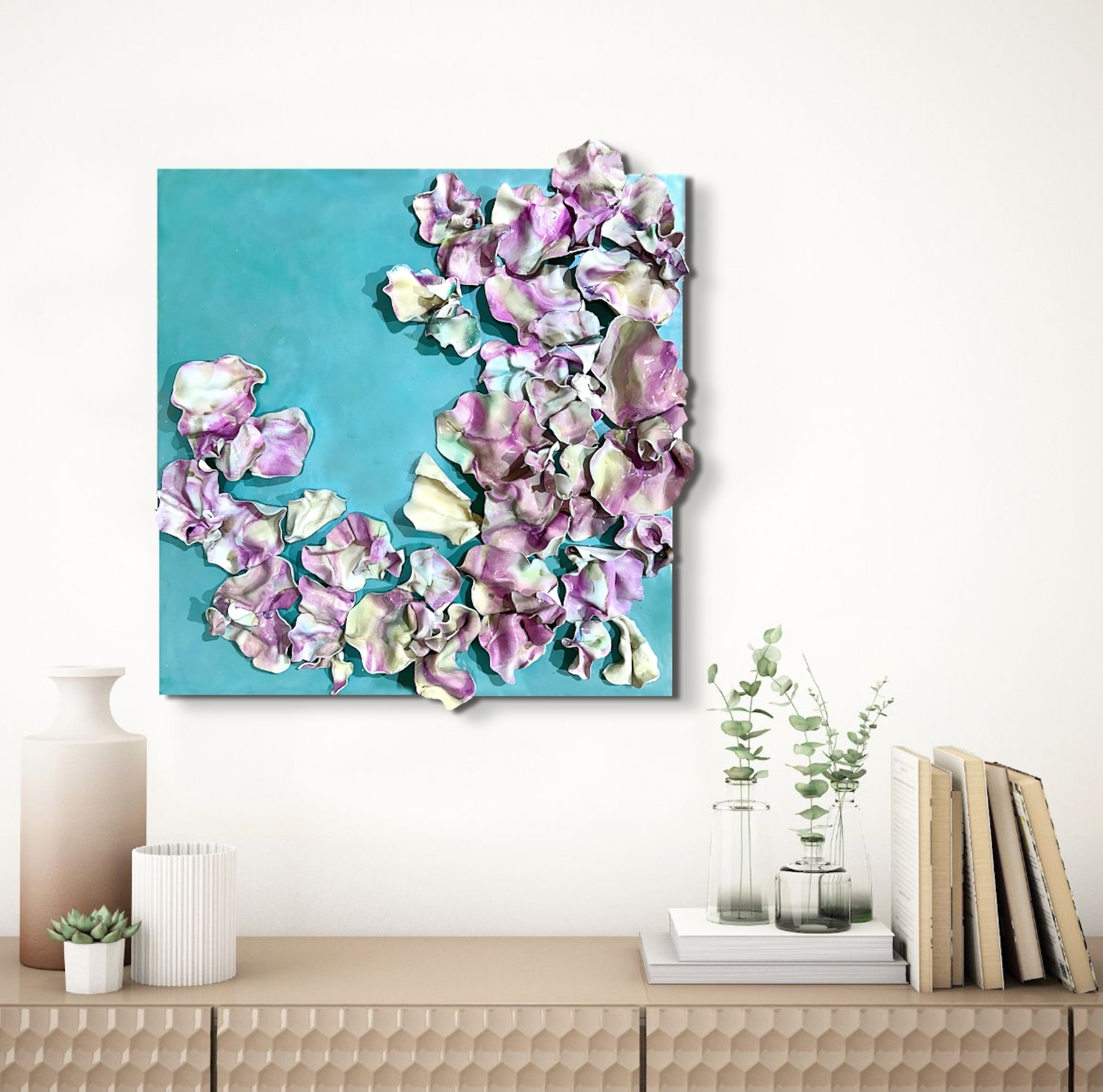 The fluidity and versatility inherent in encaustic painting enable me to delve into the complexities of organic forms, crafting textured surfaces and luminous depths that mirror the beauty and transience of the natural world. My work is characterized by meticulously hand-sculpted 3D forms that burst with vibrant colors, layered intricately throughout each composition.